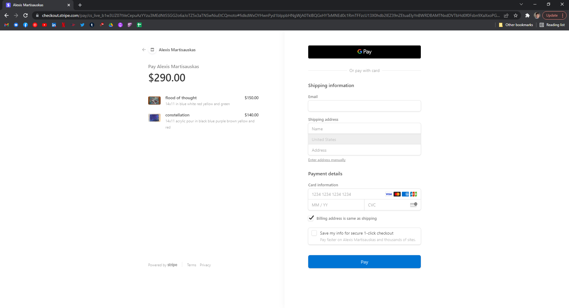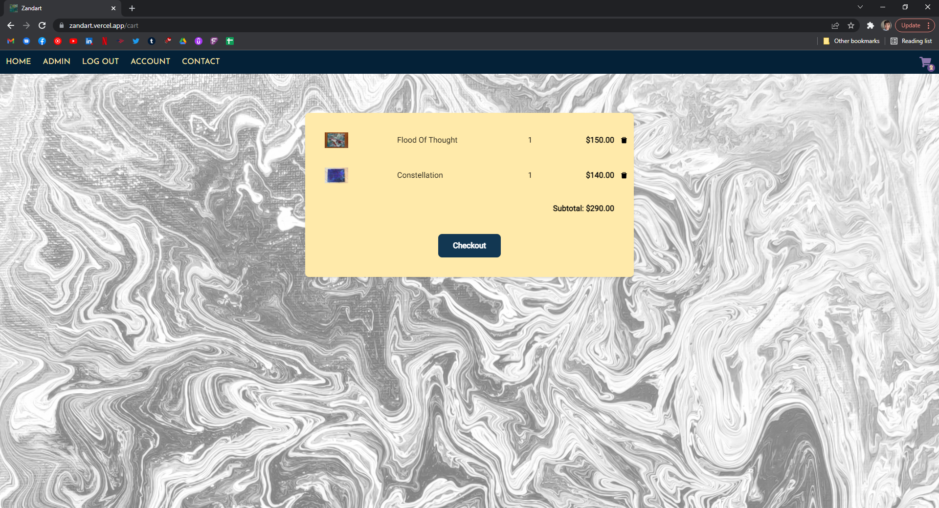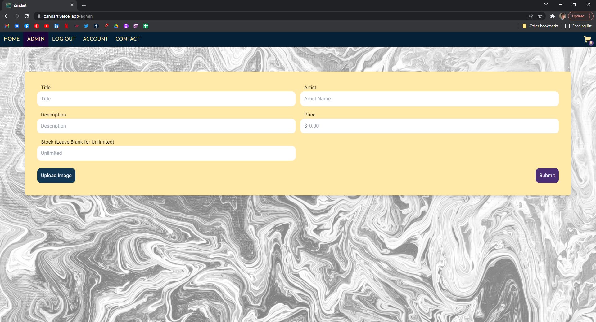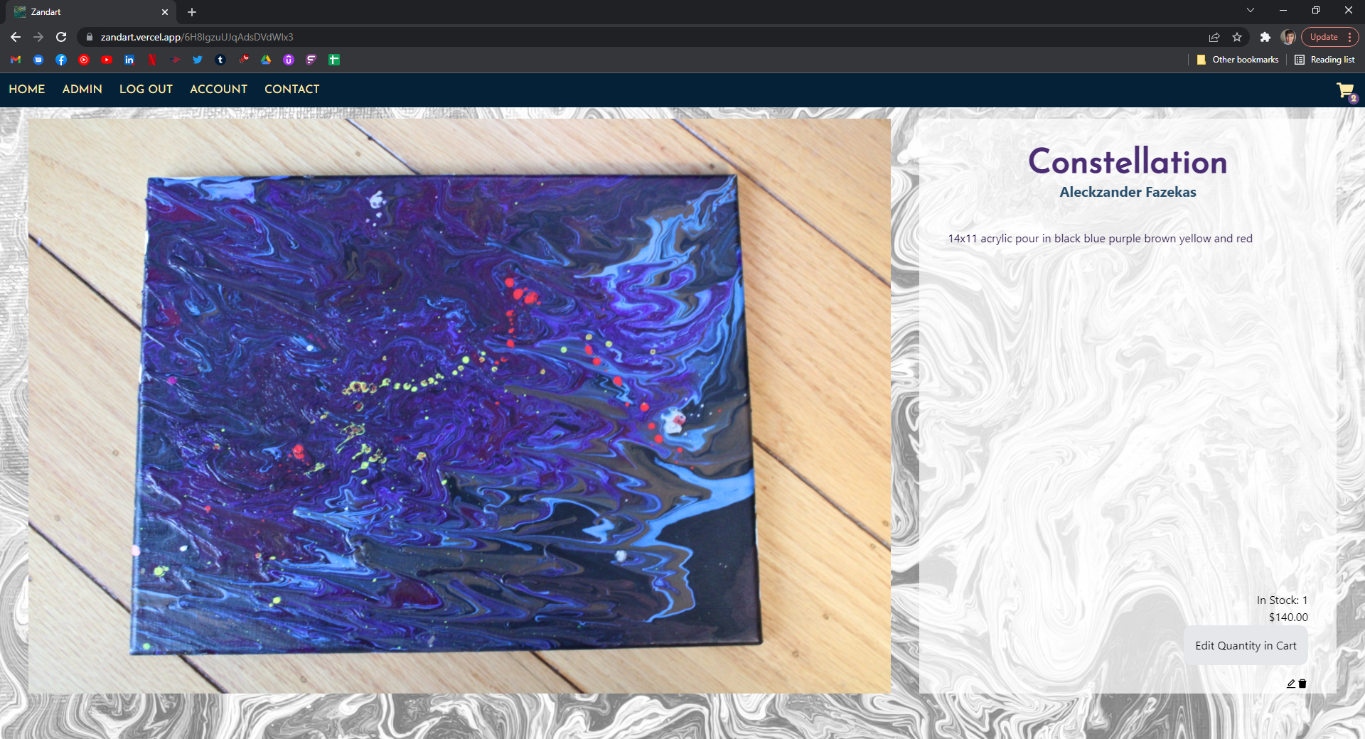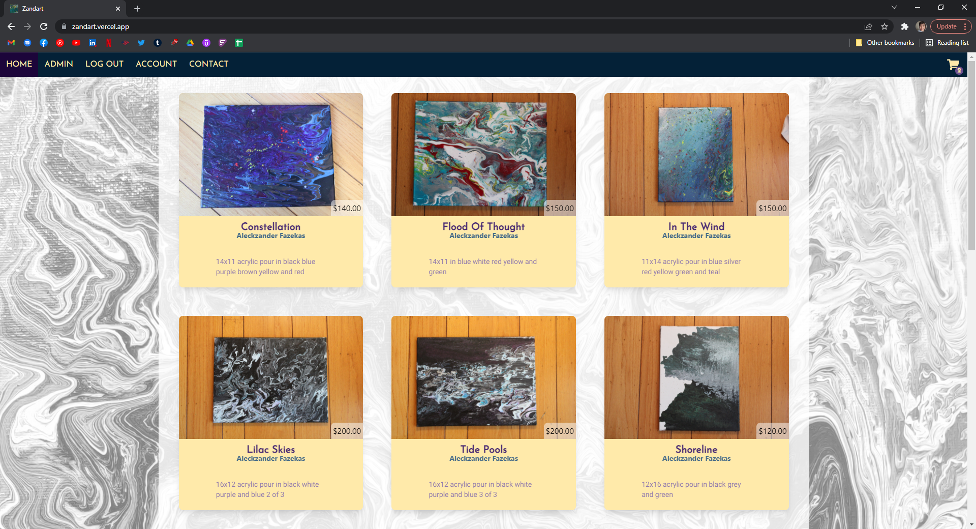 Zandart is an E-Commerce site for an artist that sells drip paintings. It uses Google Firebase as the backend to handle authentication and communication with the Stripe API. There is an interface for admins to upload art and set and edit details about the art, as well as delete it from the directory. Clients can click the art which opens a new page with extended details of the piece as well as the option to add it to the user's cart. Clicking on the cart opens a cart page and allows the user to check out with Stripe. This was tested and works correctly. This was a quick commission and is missing some features I would otherwise like to include, such as improving the way items are added to the cart so multiple copies can be added more easily, saving the cart data on the backend, allowing the user to add items to the cart from the gallery view, using thumbnails instead of full sized images on the gallery view, and the ability for the stock to update on the backend when an item is purchased.